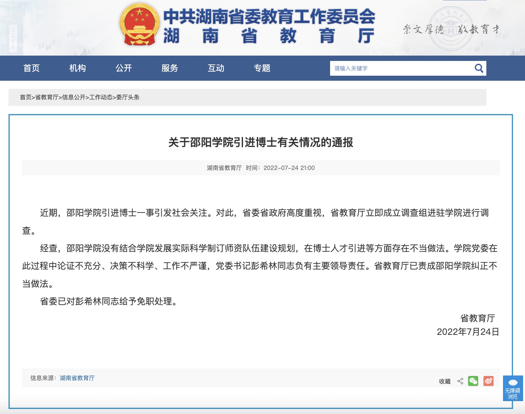 7月24日晚,湖南省教育厅网站发布《关于邵阳学院引进博士有关情况的通报》。通报全文如下: