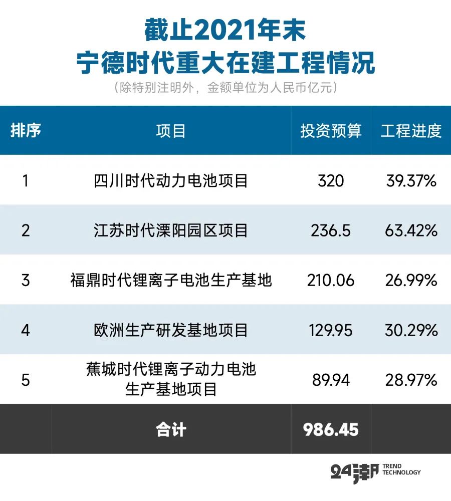 截止2021年末,宁德时代还有5个重大项目进入执行(施工)阶段,这5个项目总投资预算达986.45亿元,工程进度在28%-63%之间。