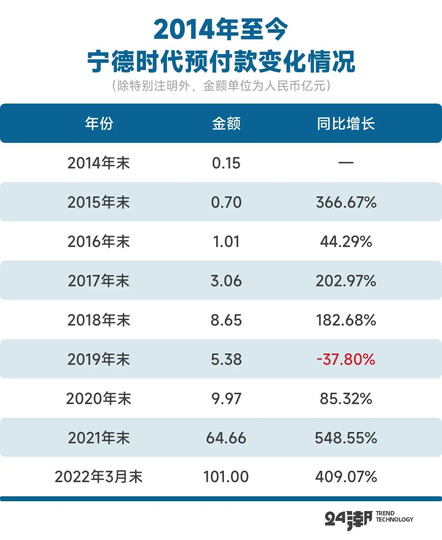据24潮统计,2021年末宁德时代预付款规模为64.66亿元,同比增长了548.55%,2022年一季度再次刷新记录,预付款规模增至101亿元,同比增长了409.07%。