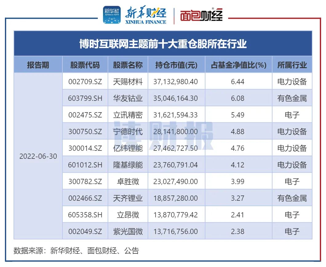 但是,2022年二季度末,博时互联网主题的前十大重仓股中(申万一级行业分类,下同),超过一半持仓为新能源产业链相关企业,包括天赐材料、华友钴业、宁德时代、亿纬锂能等。