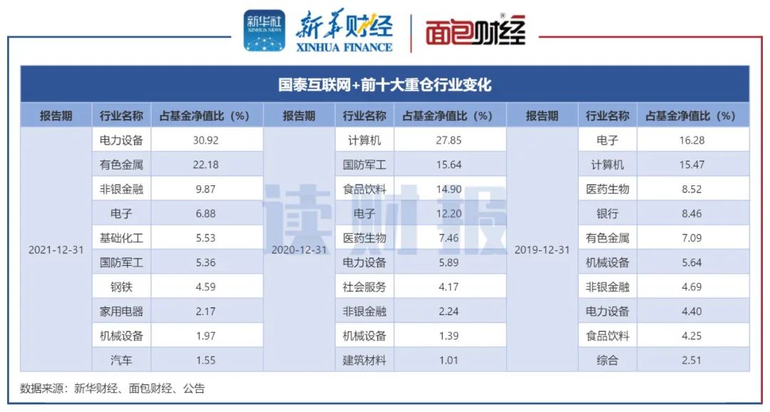 但从该基金2019年末至2021年末的前十大重仓行业变化情况来看,国泰互联网+持有占比位居前列的行业逐步从电子、计算机向电力设备、有色金属转移,与基金“互联网+”的主题偏离较大。