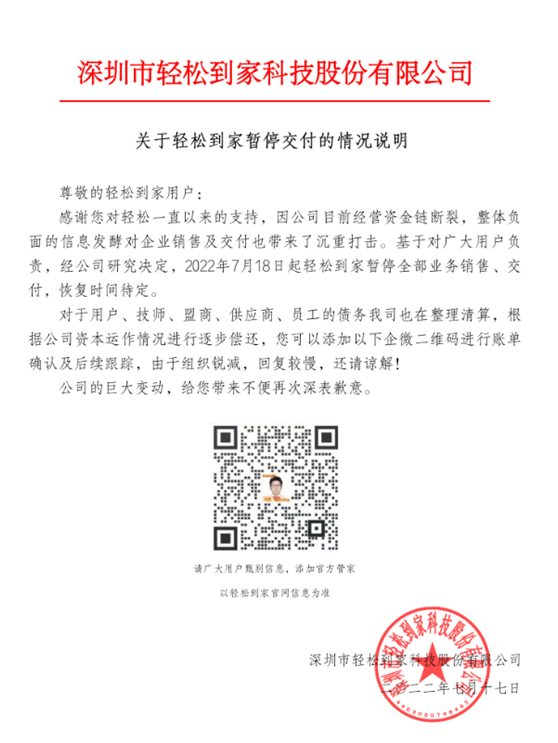7月8日,轻松到家发布阶段性经营困难的情况说明,把问题的源头指向轮番出现的疫情。7月17日,公司发布关于暂停交付的情况说明。