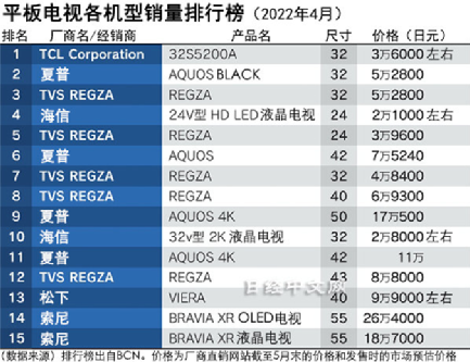 2022年4月,日本电视市场销量第一的电视型号竟然是来自中国TCL。日本市场2022年4月最畅销的电视型号来自TCL,夏普, TVS Regza(东芝电视,已经被海信收购,经营Regza品牌)。