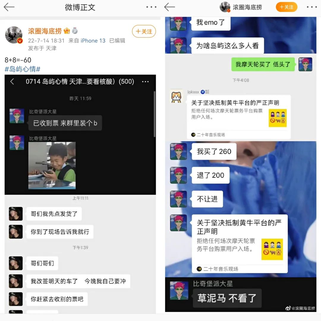 令大星意外的是,他的经历也被摇滚圈大V@滚圈海底捞 发布到了微博上后,迅速引起很多乐迷的关注,大家在调侃他的同时,再次围绕着“抵制摩天轮”、“抵制黄牛平台”展开了论战与声讨。