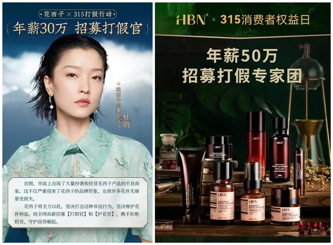 这一点作为国货美妆中打假的先行者,花西子早在2020年3月,就曾向外界发布“高薪招募打假官”的信息,面向全国招募首席打假官。之后的1个月,花西子再次追加30万打假基金,招募“护花官”邀请全民参与打假。