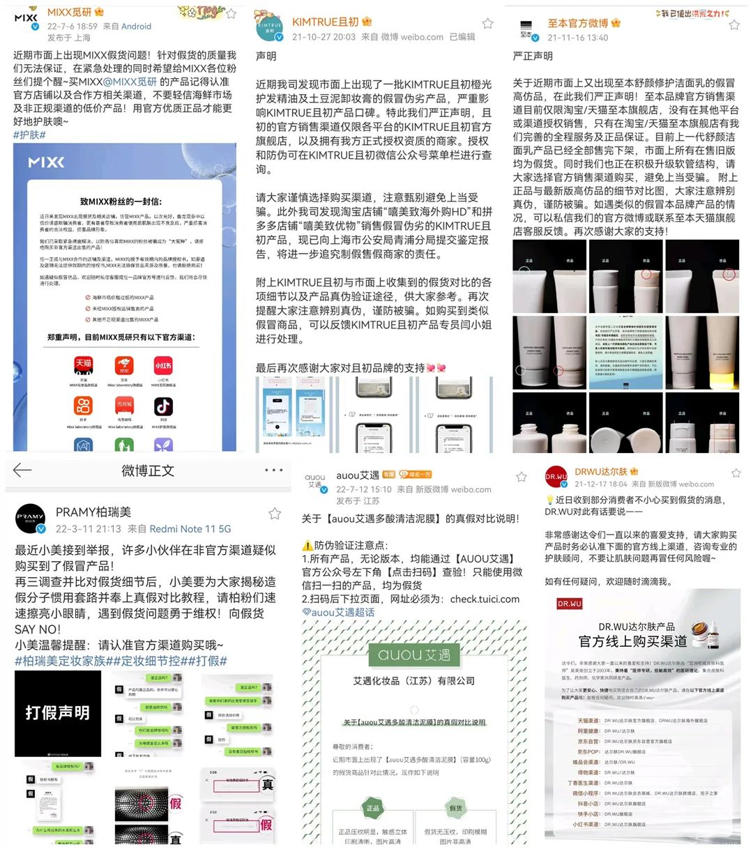 其中第一点第二点也是最基础的两点,包括花西子、完美日记、柏瑞美、至本、艾遇、芙清、贝德玛、蜜丝婷、尔木萄等绝大部分的品牌,都曾在各大社媒品牌上发布相关打假信息,并为消费者提供正品甄别方法和官方渠道的提示。