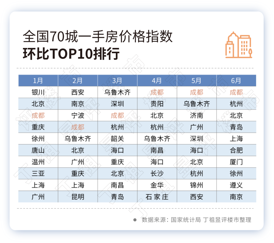 从房价环比涨幅情况,成都自4月一跃领涨全国后,已连续三个月环比涨幅位列全国第一位,至6月,新建商品住宅价格环比上涨1.3%,再次领涨全国。同比涨幅也一跃至全国第四位,同比上涨4.5%。