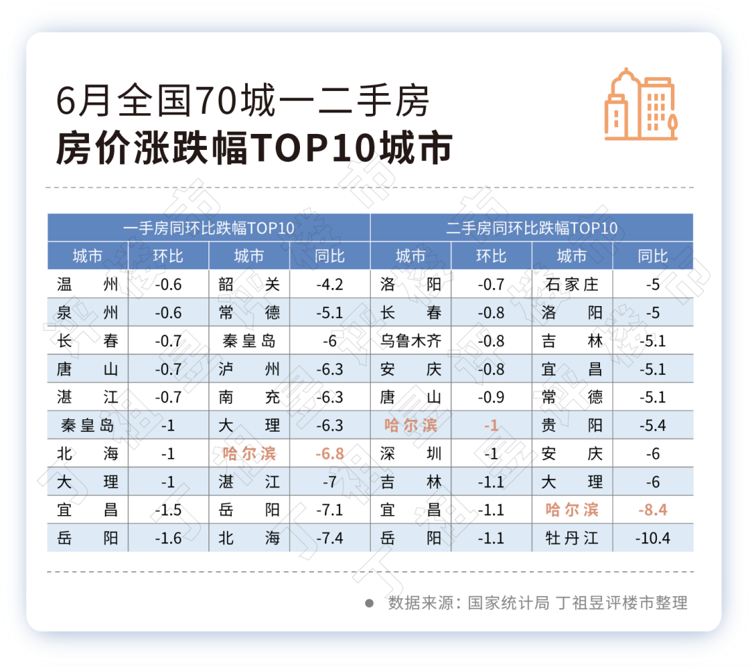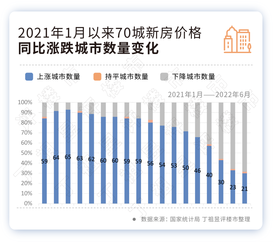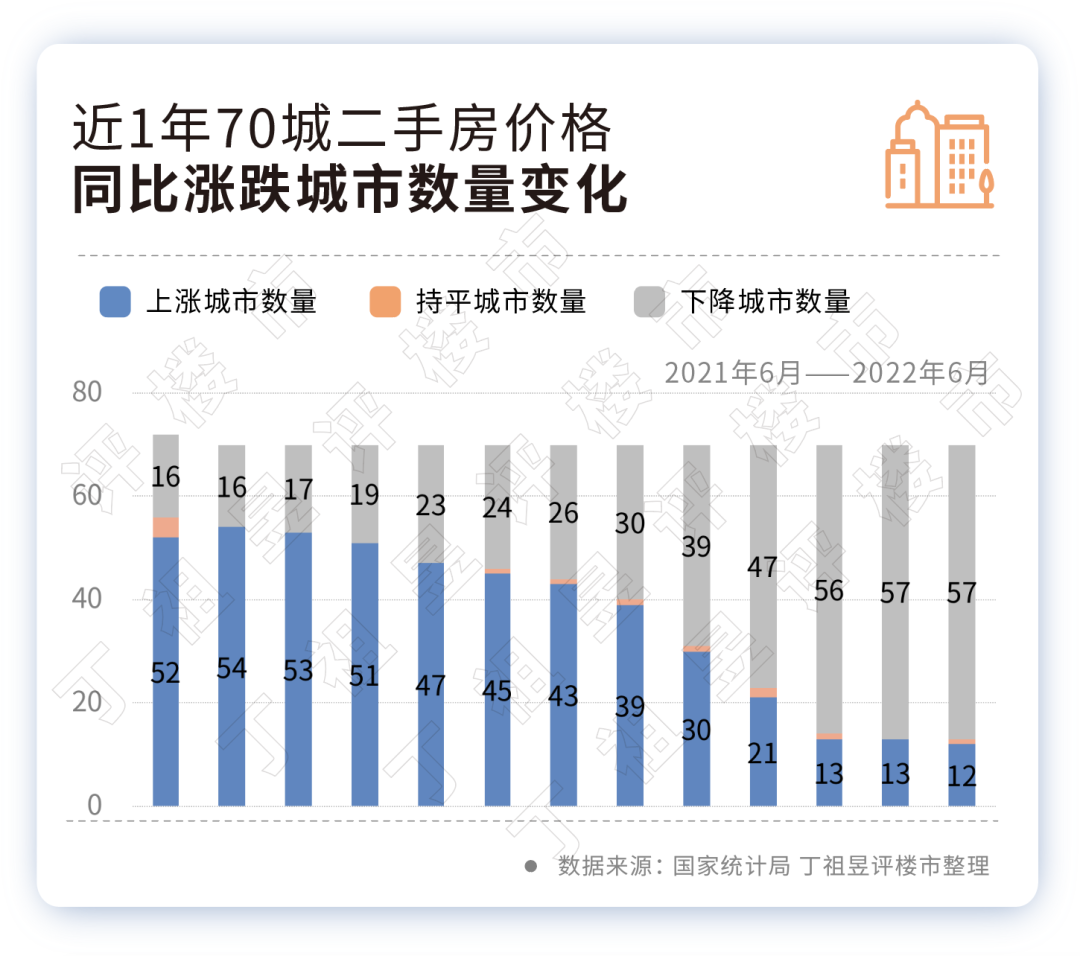 从国家统计局公布的数据可以看出,6月70个大中城市新建商品住宅销售价格同比下降1.3%,下降城市个数扩大至48个,二手房价格同比下跌的城市达到了57个。