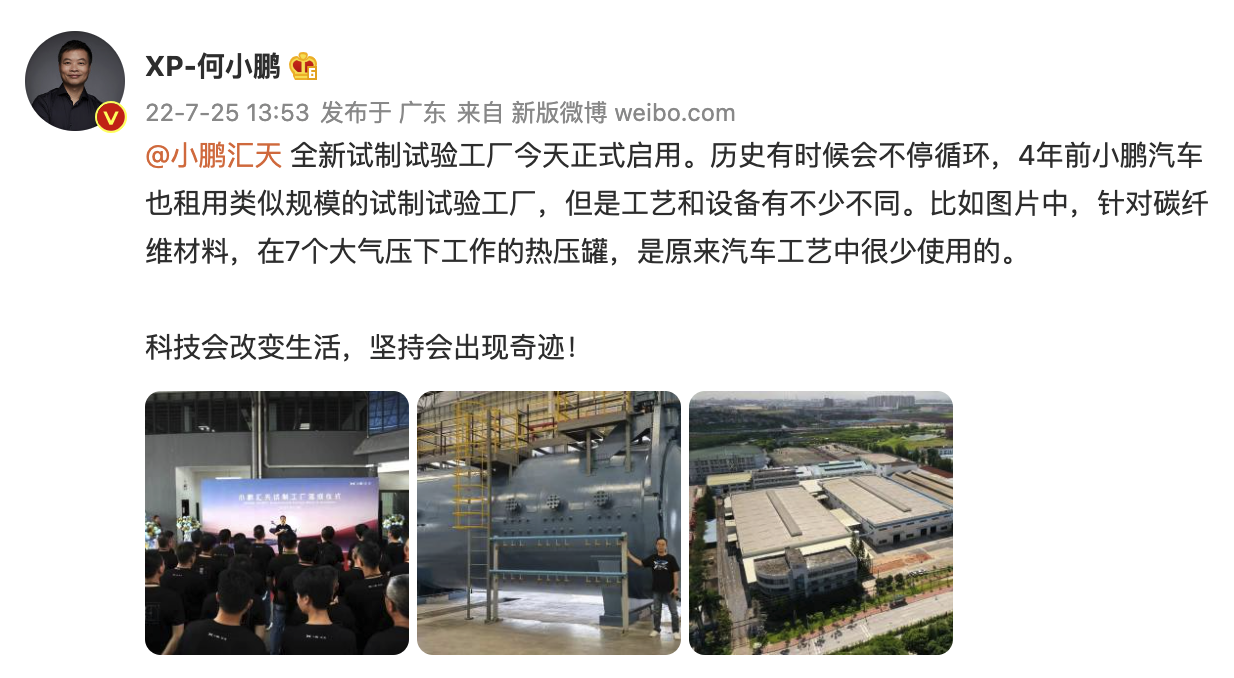 7月25日,小鹏汽车董事长何小鹏发布微博称,小鹏汇天全新试制试验工厂今天正式启用。历史有时候会不停循环,4年前小鹏汽车也租用类似规模的试制试验工厂,但是工艺和设备有不少不同。比如图片中,针对碳纤维材料,在7个大气压下工作的热压罐,是原来汽车工艺中很少使用的。