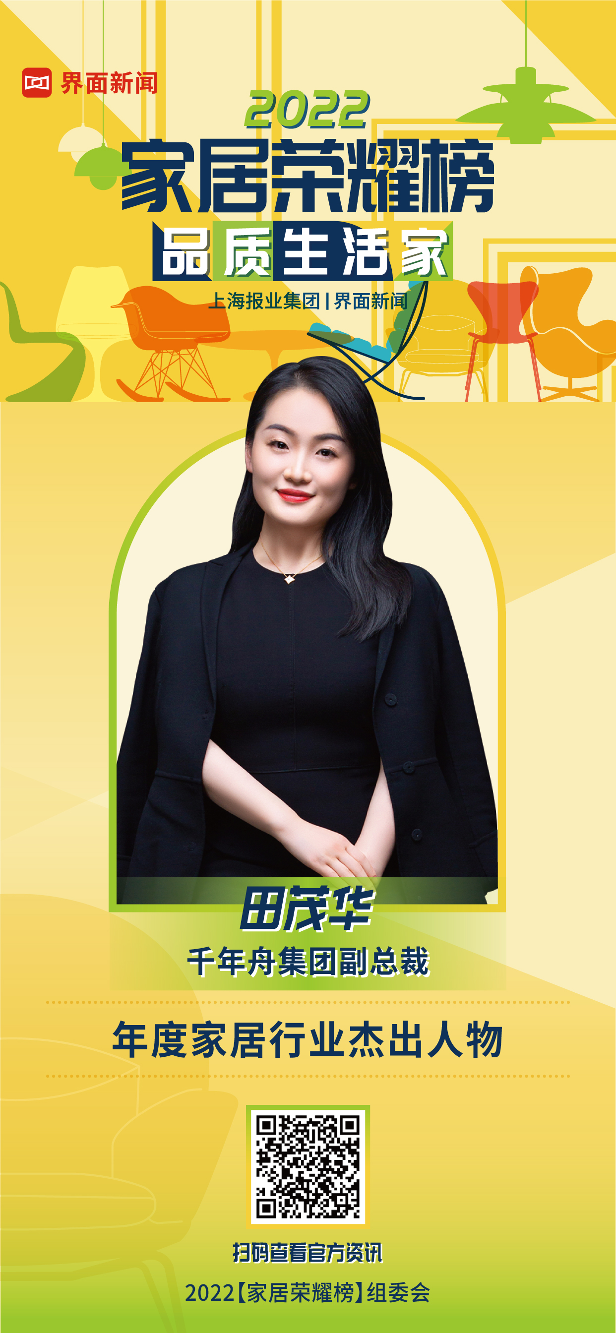7月28日,由上海报业集团l界面新闻发起的2022【家居荣耀榜】,正式公布了本年度获奖名单。提供科学的选购指南,打造品质生活、美好安居,众多家居行业知名品牌积极参与本次评选。千年舟集团副总裁田茂华女士凭借对家居行业的杰出贡献,荣膺年度家居行业杰出人物称号。