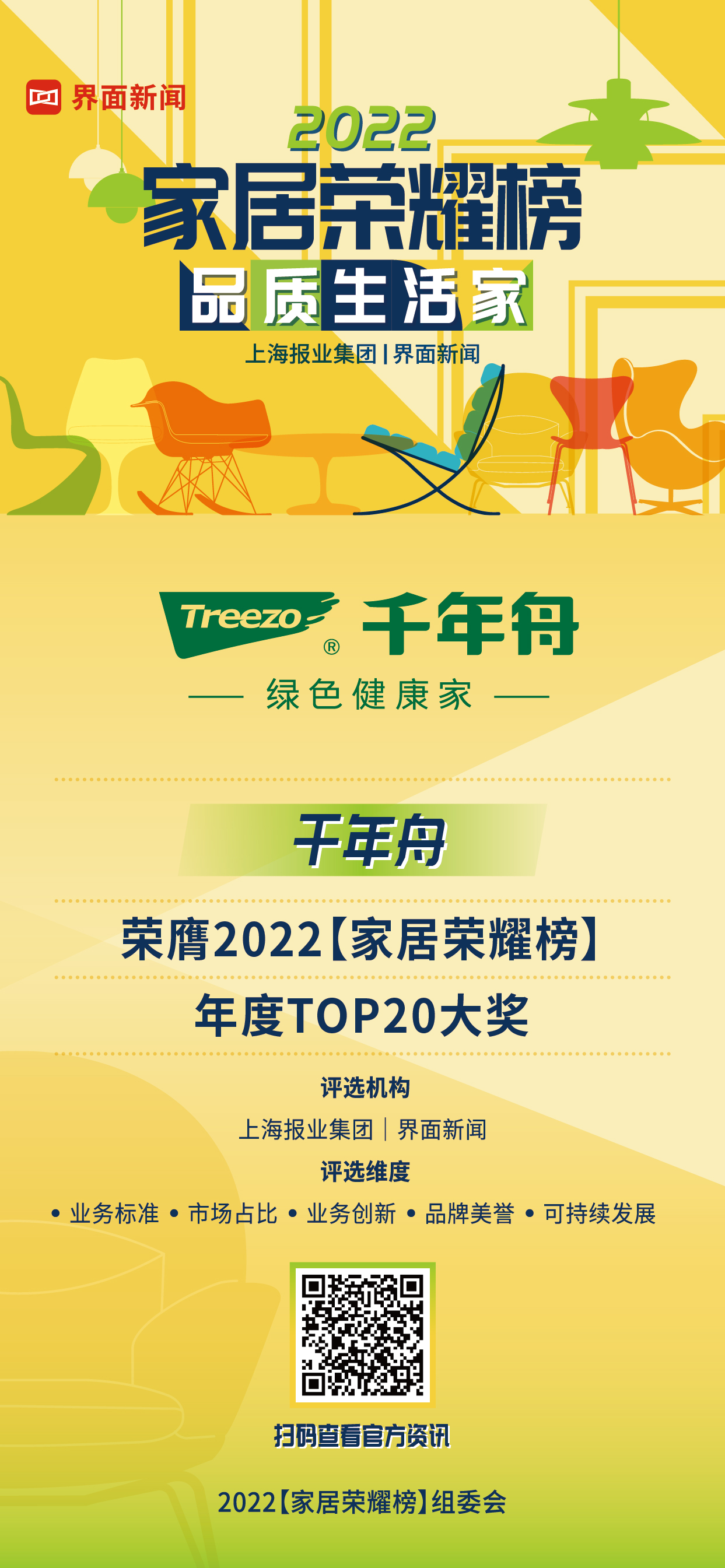 7月28日,由上海报业集团l界面新闻发起的2022【家居荣耀榜】,正式公布了本年度获奖名单。提供科学的选购指南,打造品质生活、美好安居。综合社会各界的意见与建议,来自家居行业各细分领域的20家优秀品牌,在激烈角逐中夺得了年度大奖。千年舟凭借对环保装饰材料的品质把控,荣膺年度TOP20大奖。