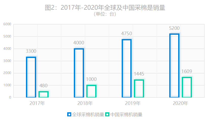 具体到数量上看,参考2020年数据,笔者认为2022年全球对采棉机约有5000台需求,其中中国不少于1500台,2022年全球保有量约60000台,说明还有市场空间。