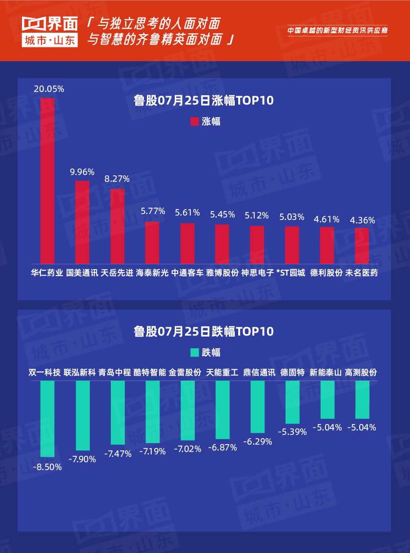 青岛市涨幅榜首:华仁药业(300110),涨幅20.05%,股价4.79元,总市值56.6亿元;
