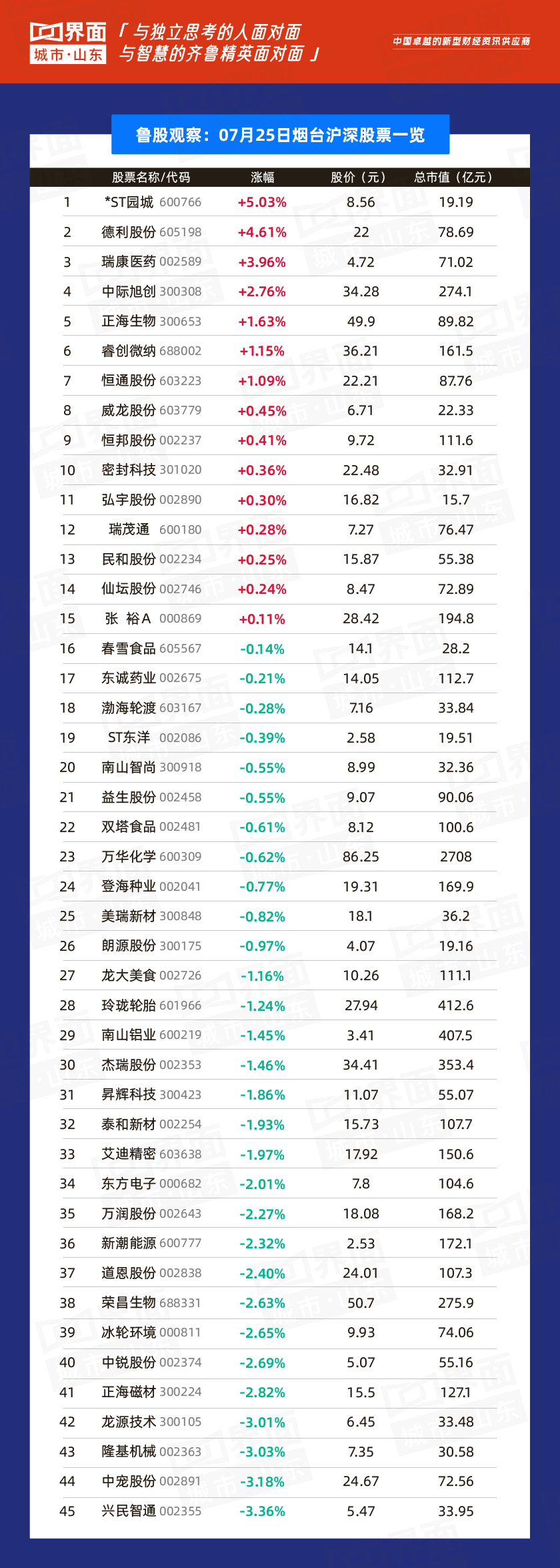 烟台市涨幅榜首:*ST园城 (600766),涨幅5.03%,股价8.56元,总市值19.2亿元;