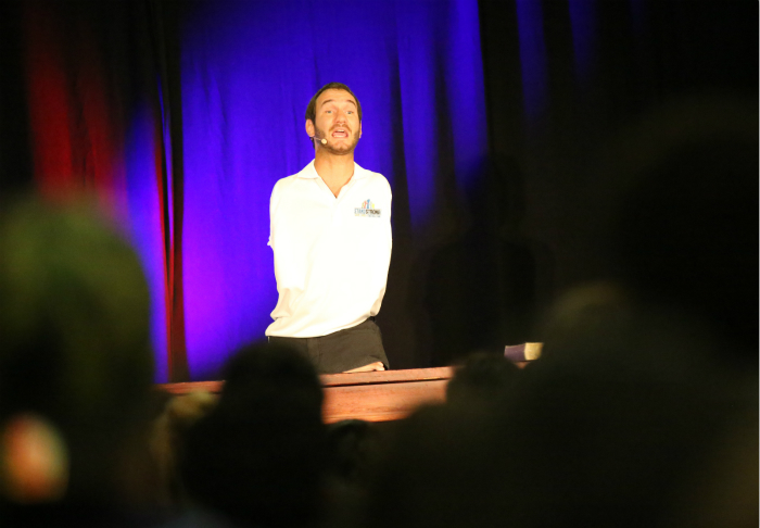 正如网上的介绍所说,尼克是在一位高中清洁工的启发下开始做公众演讲的。那位名叫阿诺的清洁工先生怂恿了尼克3个月,才让他下定决心在一个学生聚会上聊聊自己的成长经历。令他惊讶的是,当他讲完时,许多人被感动哭了。之后的一段时间里,陆陆续续有许多教会、青年团体和社团邀请他分享他的故事,他遂下定决心成为一名专业的演讲家,用自身经历激励他人。