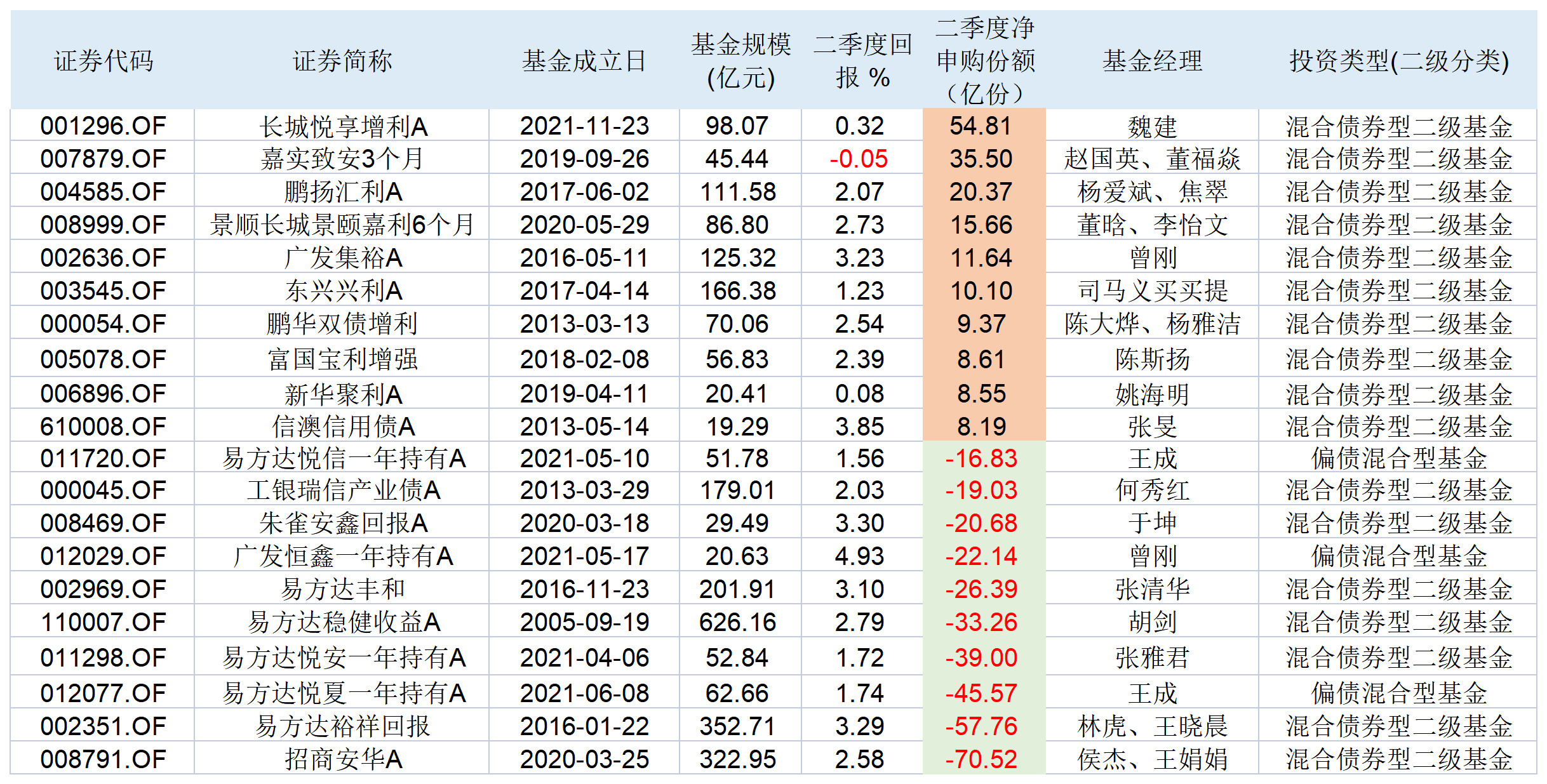 在固收+领域,嘉实、景顺长城、广发、鹏华、富国旗下的混合二级债基获得净申购。易方达因为林森的离任,多只固收+基金在二季度被大手笔净赎回。