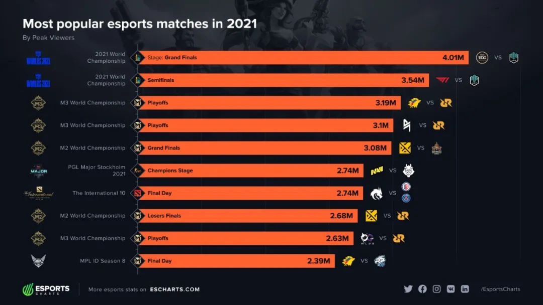 Esports Charts针对海外直播平台的相关数据统计,在2021年观看人数峰值排名前10的单场MOBA电竞比赛中,MLBB的相关赛事独占6席。
