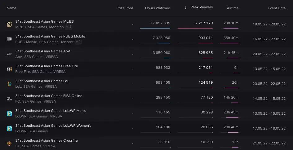 不仅如此,在刚刚结束不久的第31届东南亚运动会上,电竞赛事中,MLBB相关赛事最高同时在线人数(PCU)达到221万,总观看时长达到1785万小时,两项数据均排行本届东南亚运动会电竞项目TOP1,同时也创造了新的收视纪录。