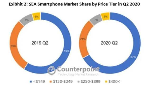 在东南亚市场,智能手机普遍的价格在200美元以下,Counterpoint发布报告显示,在2020年Q2东南亚主要的国家中,超过67%的智能手机出货是在150美元以下。