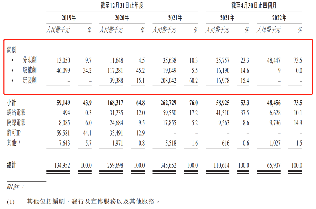 成立于2016年的耐看娱乐,乘着网剧大爆发的风口而生。从其招股书披露的数据来看,公司最初以创作分账剧与版权剧为主。但自2020年阿里向其注资后,耐看娱乐与阿里系的优酷越走越近,与之相伴,耐看娱乐的定制剧业务由此开始,2021年,公司来自定制剧的营收达到2.08亿,占总营收的60%以上。