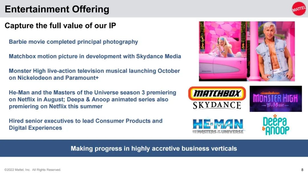 在IP驱动战略指导下,美泰正持续发力IP内容打造。据财报显示,美泰与华纳兄弟合作的芭比电影已完成主要摄影工作,预计于2023年7月21日上映。另外,美泰还将与Skydance Media公司合作开发火柴盒(Matchbox)品牌相关电影。