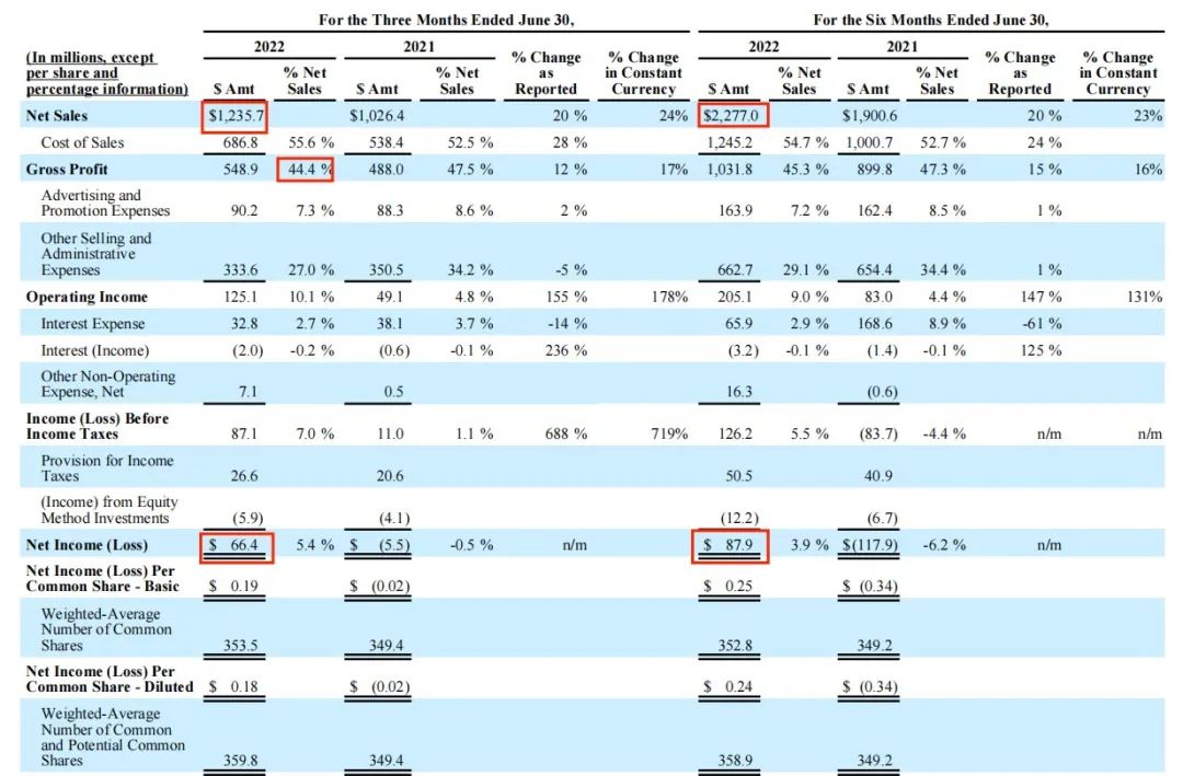2022年Q2,美泰的净销售额为12.36亿美元,同比增长20%,实现净利润6640万美元。上半年的总净销售额为22.77亿美元,同样同比增长20%,实现净利润8790万美元。其净利润与去年同期的亏损相比,均有着稳定的表现,但毛利率与去年同期相比有所下降。