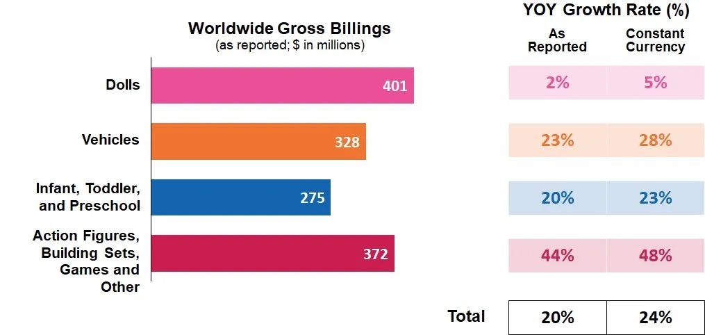 总体持续增长:可动人偶、建筑套装、游戏与其他板块增长强势,三大地区实现两位数增长
