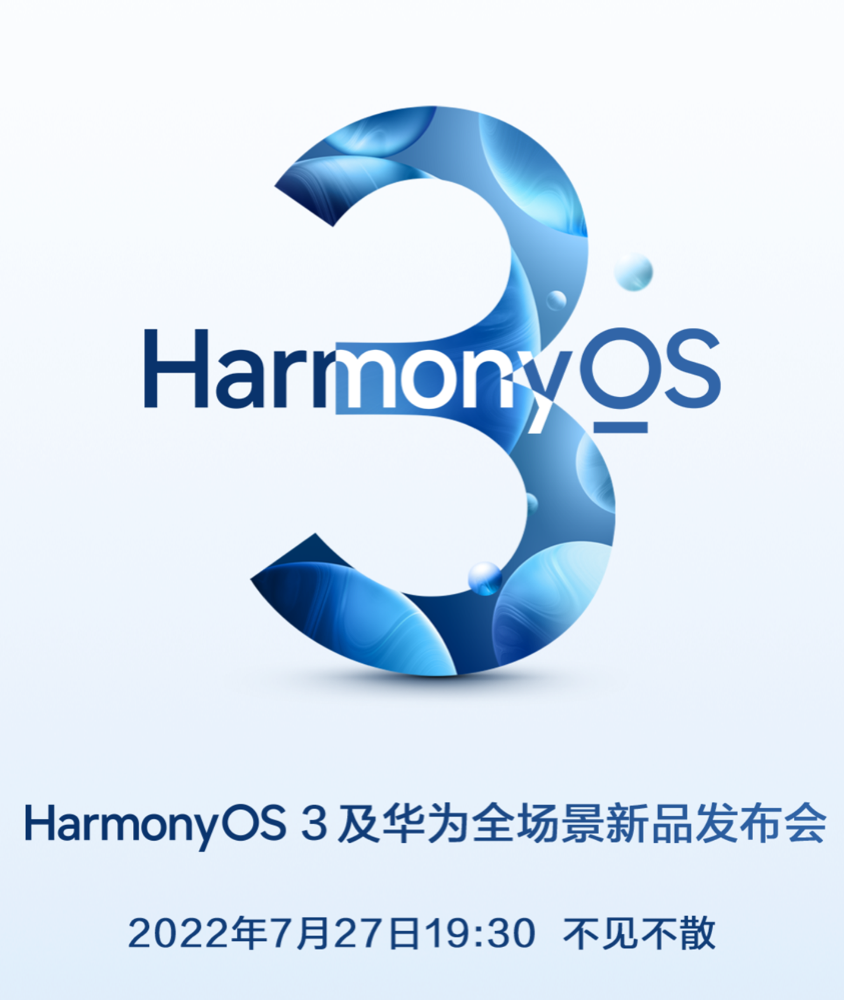 7月26日消息,华为将于7月27日19:30举行HarmonyOS 3及华为全场景新品发布会。