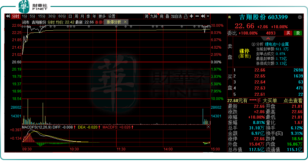 此可谓是吉翔股份收购永杉锂业以来的首次加码产能扩张。消息刺激下,7月25日,吉翔股份异动拉升,盘中冲击涨停,收报22.66元/股,总市值达117.5亿元。