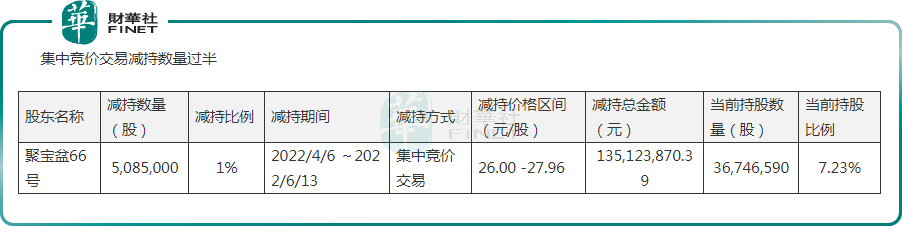 3月10日,股东聚宝盆66号公告,拟于2022年4月1日至9月28日之间,减持公司股份不超过30,511,418股,即不超过6%的公司股份。截至6月13日,聚宝盆66号减持计划累计减持数量过半。