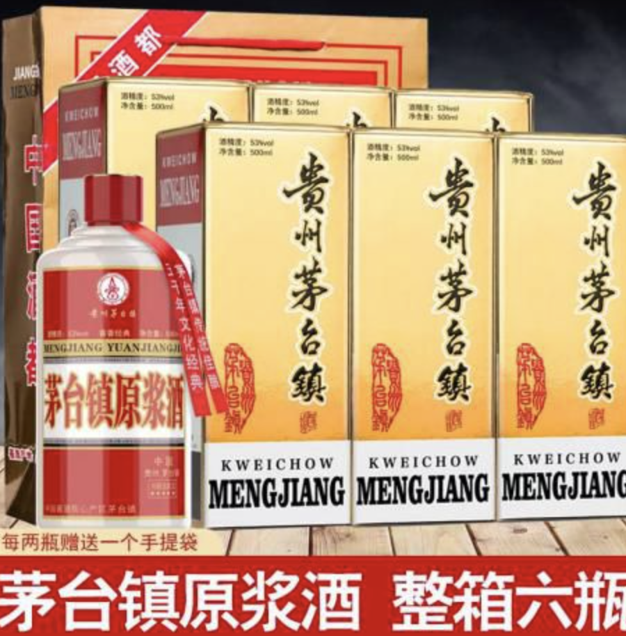 这款“茅台镇原浆酒”采用和“贵州茅台酒”正面“KWEICHOWMOUTAI”相同的字体,在正面标注了“GUIZHOUMENGJIANGJIAOJIU”,背面瓶贴上白下红,左右两边也有着相似的麦穗图案。