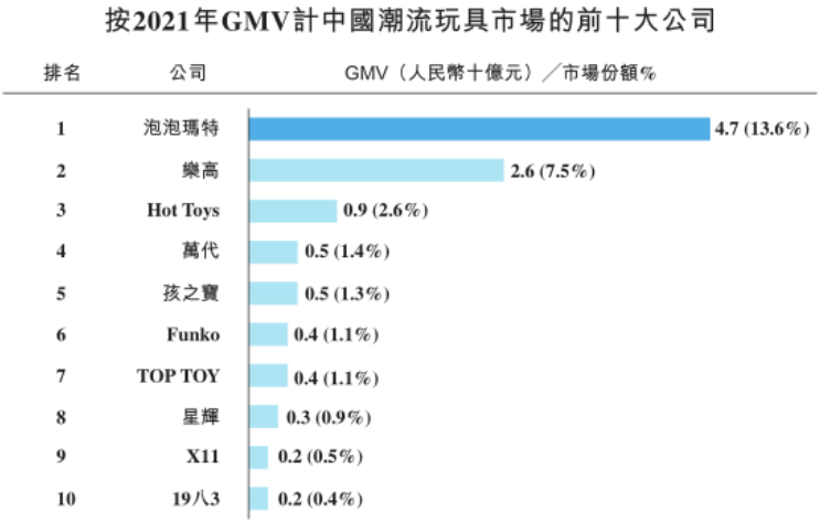 根据弗若斯特沙利文报告,2021年,TOP TOY市场份额约为1.1%,按GMV计,在中国潮流玩具市场参与者中排名第七。