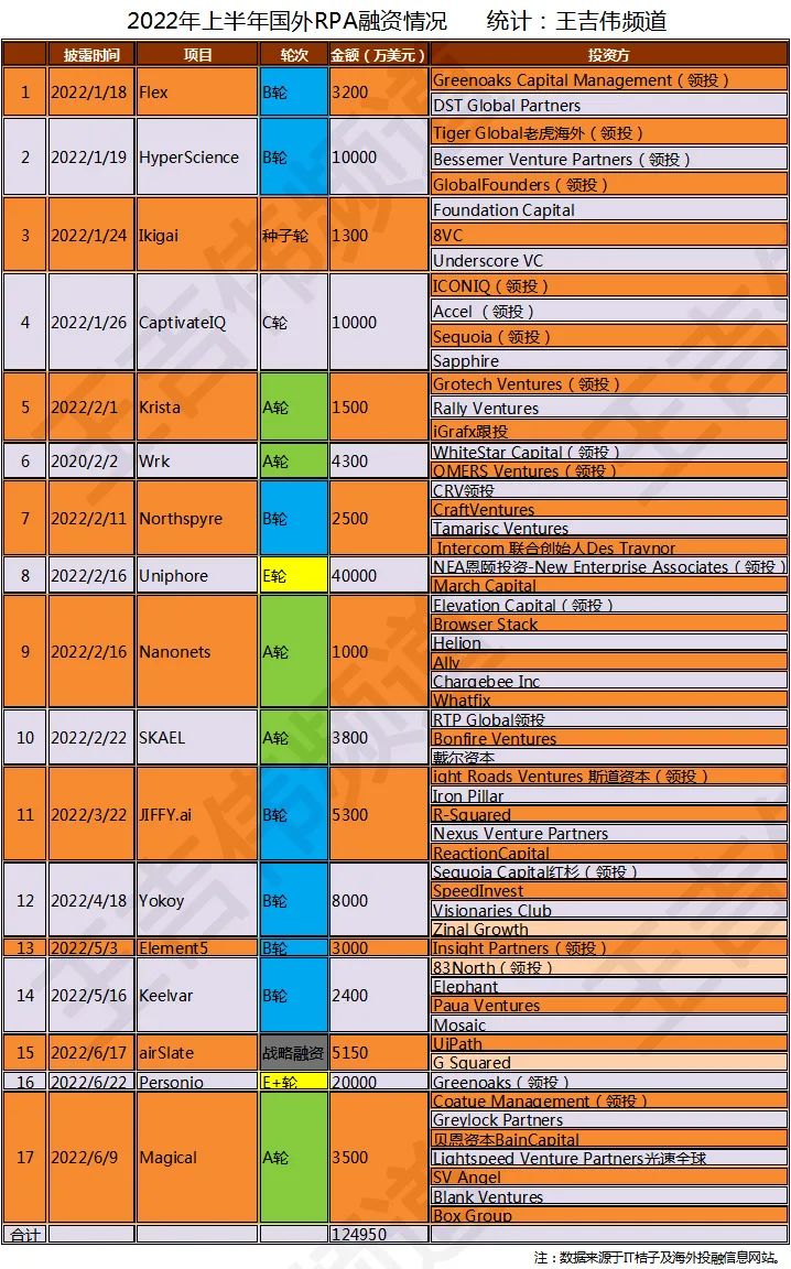公开资料显示,2022年上半年国外共有17起RPA融资事件。从融资进程来看,种子轮融资1起,A轮融资5起,B轮融资7起,C轮融资1起,E轮及以上融资2起,战略融资1起。