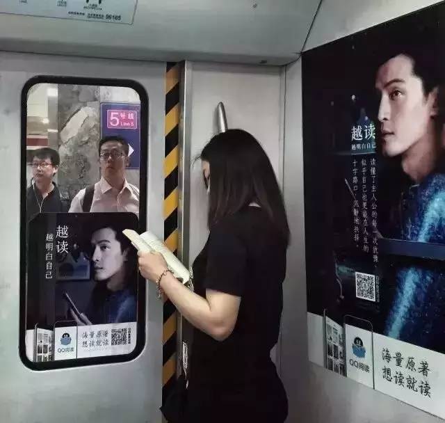 可有的读书人就是不买账,偏偏喜欢在地铁里捧着本纸质书读。那天我就看到一个姑娘在两幅海报夹着的缝隙里埋头读一本书,估计 QQ 阅读的员工们并不乐见于此。