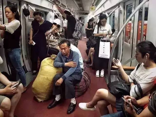 地铁里还经常能碰到“自带座”的乘客。“自带座”指的是他们的行李体积足够大,能当座。行李多点的坐上去跟坐小沙发差不多。有时候地铁到站开门,两位大哥正对着门坐在行李上,猛一看以为是俩话事人级别的大佬在谈业务,周围一帮小弟簇拥着。