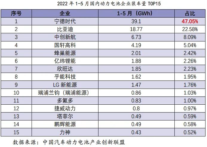 根据中国汽车动力电池产业创新联盟的数据,2022年1-5月,宁德时代的市场占有率达到了47.05%,稳居市场第一。