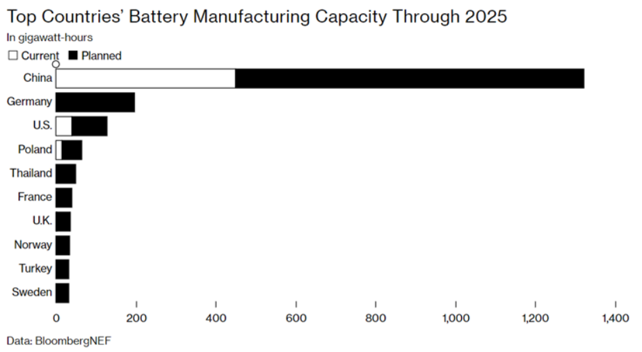 截至2025年,全球主要国家电池产能,图片来自彭博新能源财经。