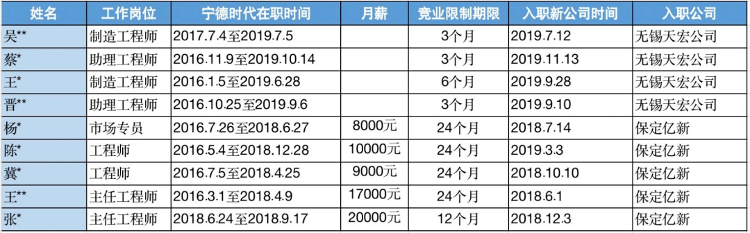 在跟蜂巢能源的诉讼纠纷中,遭索赔的9名员工的月工资在8000元-20000元不等,他们在宁德时代就职时的职位高低也不同,有主任工程师,也有市场专员,在宁德时代的工作年限最长2年,最短才3个月。