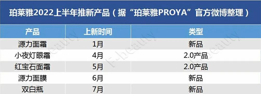 除了产品升级,今年上半年珀莱雅还分别在1月上线了源力面霜、6月上线了源力面膜,7月初上线了双白瓶三款新产品。