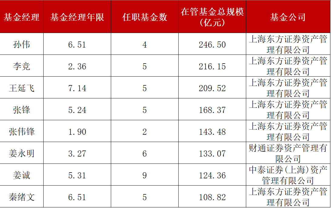 东证资管的孙伟、李竞、王延飞、张锋、张伟锋规模靠前,前三名管理规模超200亿元。