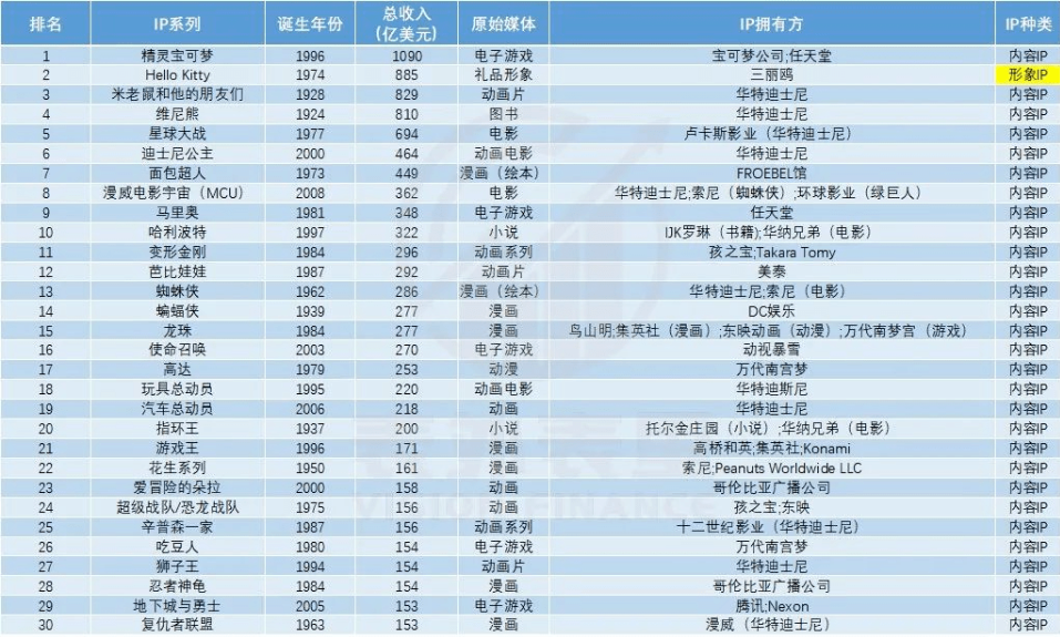 全球最有价值的IPtop 30排名中,只有Hello Kitt属于形象IP,其他(如蝙蝠侠、哈利波特等)均为内容IP。