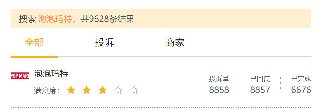 随着泡泡玛特的商品质量问题增多,玩家们感觉“越来越不值”。在小红书上搜索“泡泡玛特”,排名前三的搜索关键词就是“退坑”;黑猫投诉平台显示,泡泡玛特的投诉量已将近万条,创下新高。