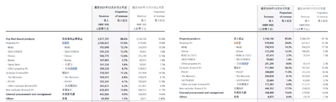 首次登上2021年财报的新IP SKULLPANDA和Bunny,前者的收入占比几乎已与Molly持平,一跃成为公司第二大IP,但后者过去一年的收入占比并未明显增长。