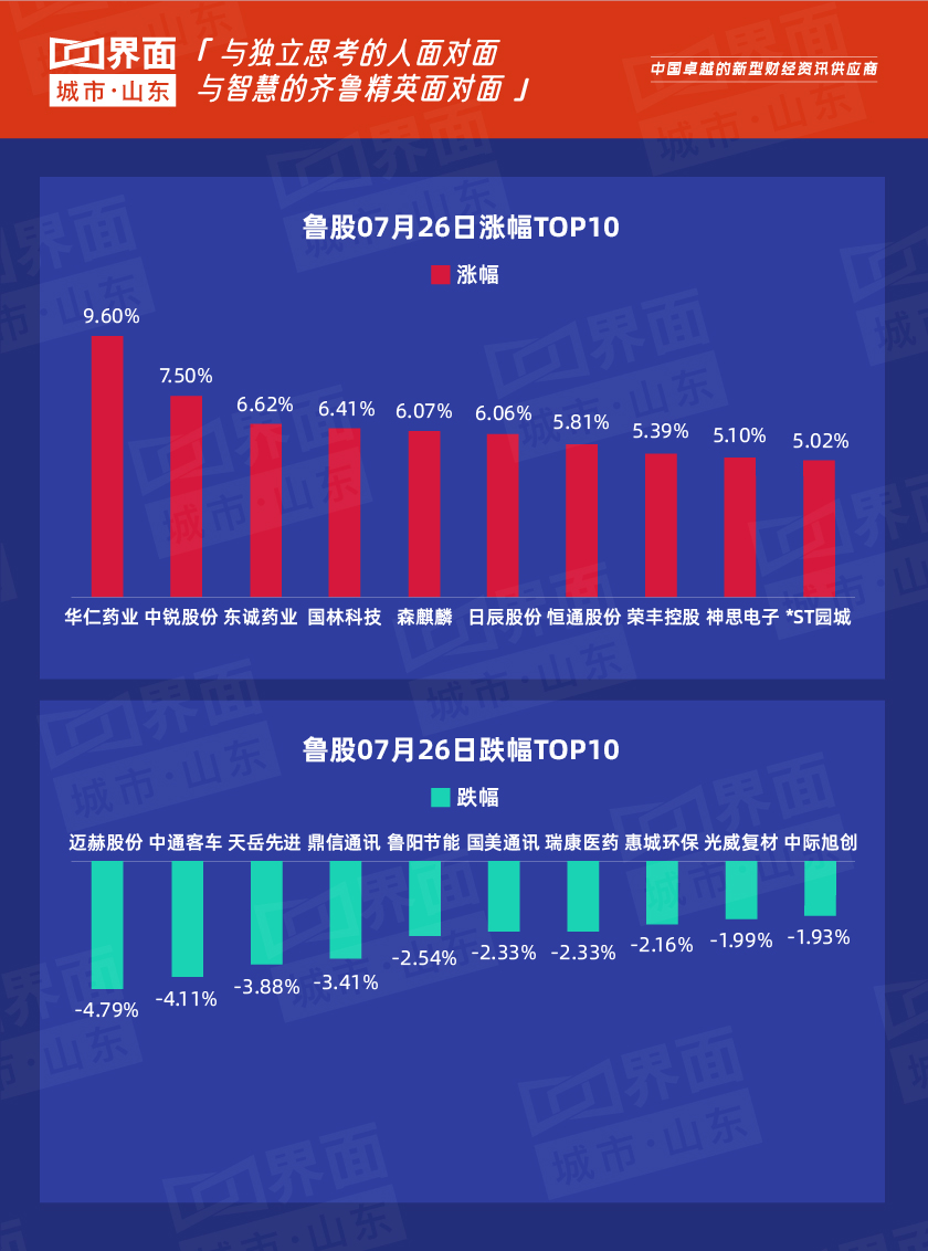 7月26日,山东省内沪深股票有212只个股上涨,50只个股下跌;总市值过千亿的有万华化学(600309)、海尔智家(600690)、兖州煤业(600188)、歌尔股份(002241)、青岛啤酒(600600)、中航沈飞(600760)、潍柴动力(000338)共7家,500亿-1000亿的共有4家,分别是山东黄金(600547)、华鲁恒升(600426)、华熙生物(688363)、联泓新科(003022)、中泰证券(600918)。