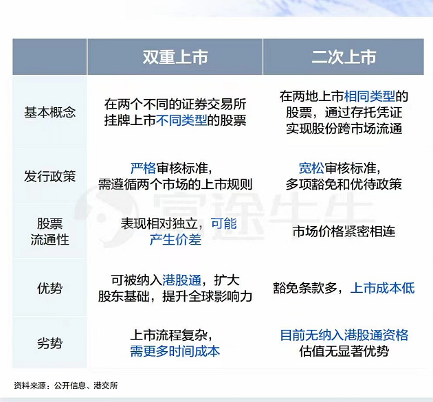 两地上市优势在于监管要求比较简单,相对双重上市有较多豁免优待条款,上市成本较低,但定价和原市场基本一致,认购时如果原市场价格波动,跌出定价区间,则打新破发风险较高;另一个劣势是未来被纳入港股通难度较大(内地曾与港交所达成过一项协议,协议的内容包括将第二上市和具有加权投票权的公司排除在沪、深港通的名单外,除非上交所、深交所、香港联交所重新修改协议)。