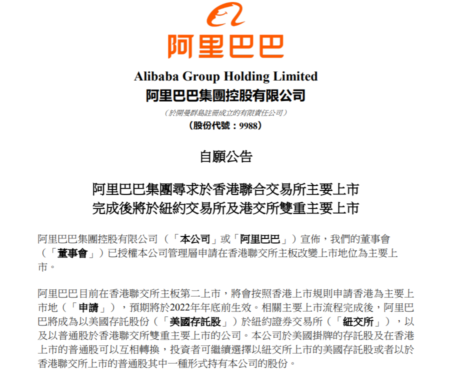 7月26日,阿里巴巴公告称,目前在香港联交所主板第二上市,将会按照香港上市规则申请香港为主要上市地,预期将于2022年年底前生效。相关主要上市流程完成后,阿里巴巴将成为以美国存托股份于纽约证券交易所,以及以普通股于香港联交所双重主要上市的公司。