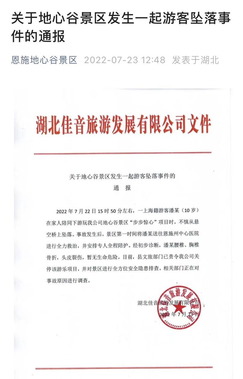 无独有偶,同日,湖北恩施地心谷景区的“步步惊心”项目也发生一起游客坠落事件。据湖北恩施地心谷景区微信公众号通报,2022年7月22日15时50分左右,一上海籍游客潘某(10岁)在家人陪同下游玩地心谷景区“步步惊心”项目时,不慎从悬空桥上坠落。经初步诊断,潘某腰椎、胸椎骨折,头皮裂伤,暂无生命危险。目前,涉事项目均已关停整顿。