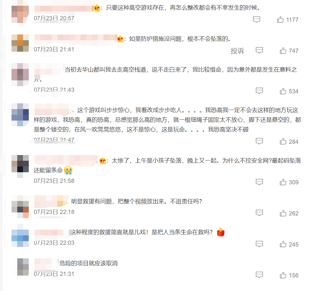 同一项目一天发生两起意外事故,迅速在网络上传播开来,引发网友热议,众多网友纷纷表示再也不敢去玩高空项目了,同时也引发了大众对“步步惊心”项目安全性的质疑。