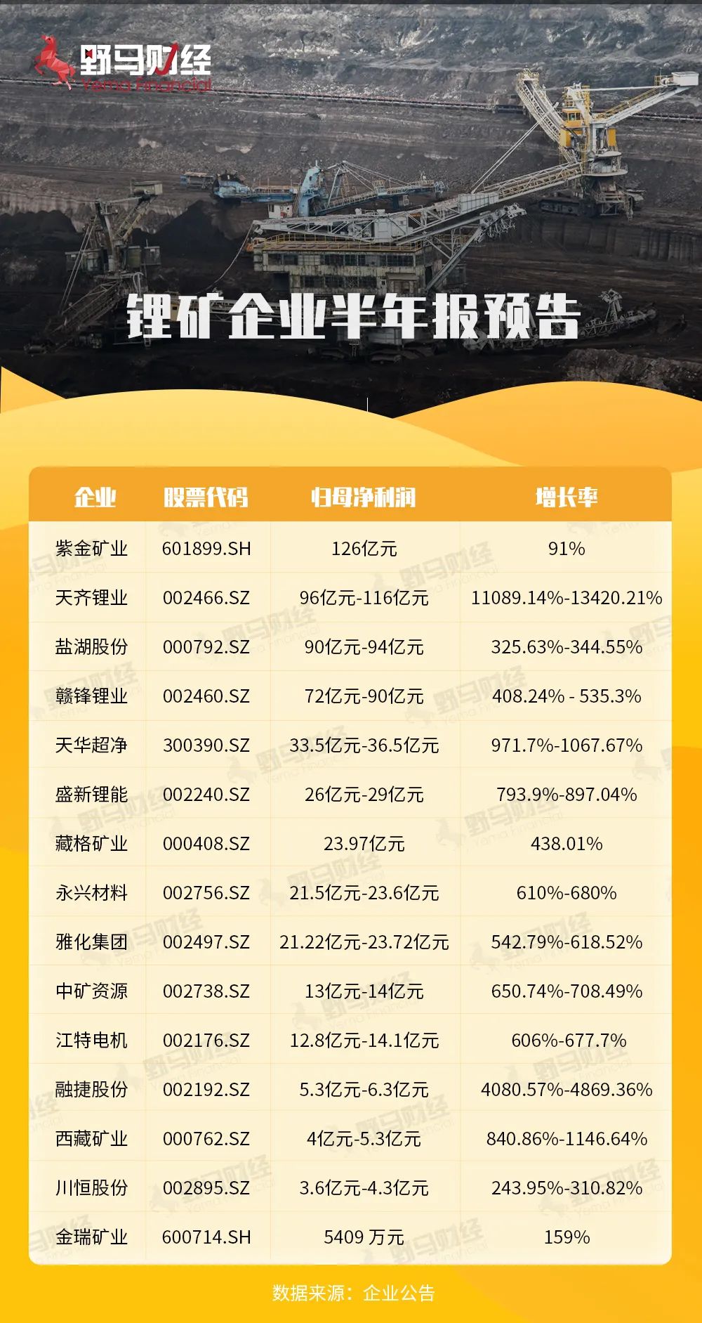 7月伊始,不少公司已经开始发布半年报预告,锂矿概念股中,半年时间最少的挣了5000余万元,最多的挣了126亿元。15家业绩预增的锂矿企业归母净利润合计达549.43亿元-607.33亿元。