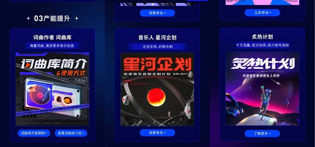 其中,像炙热星河这种开放平台,也会背靠抖音发挥歌曲宣推上的优势。根据抖音音乐数据显示,该平台歌曲每日播放 70 亿次,60%音乐人入驻1年内粉丝翻倍。